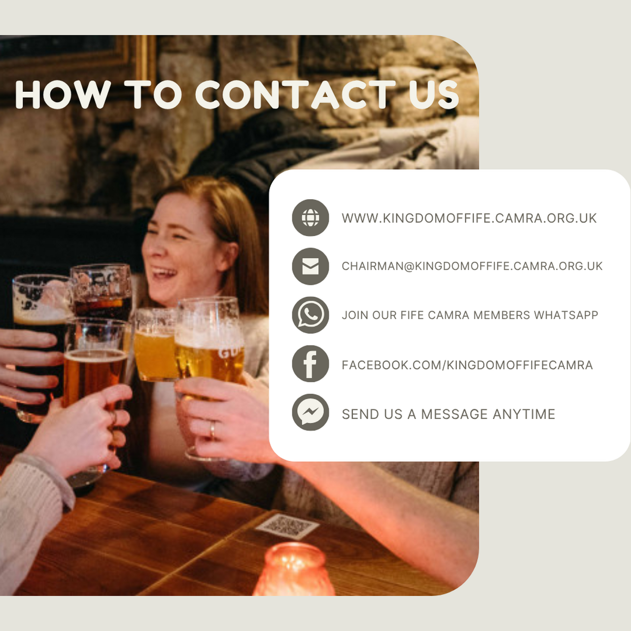 The Kingdom of Fife CAMRA is one of over 200 local branches across the UK. We celebrate and protect real ale, cider, and pub culture throughout Fife — from historic inns in the west to harbour bars in the east. Our branch works with local brewers, publicans, and members to keep real ale thriving across this unique peninsula.