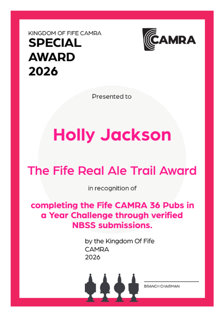 Fife is home to 36 pubs currently serving real ale, and this award celebrates members who visit every one of them within a calendar year.